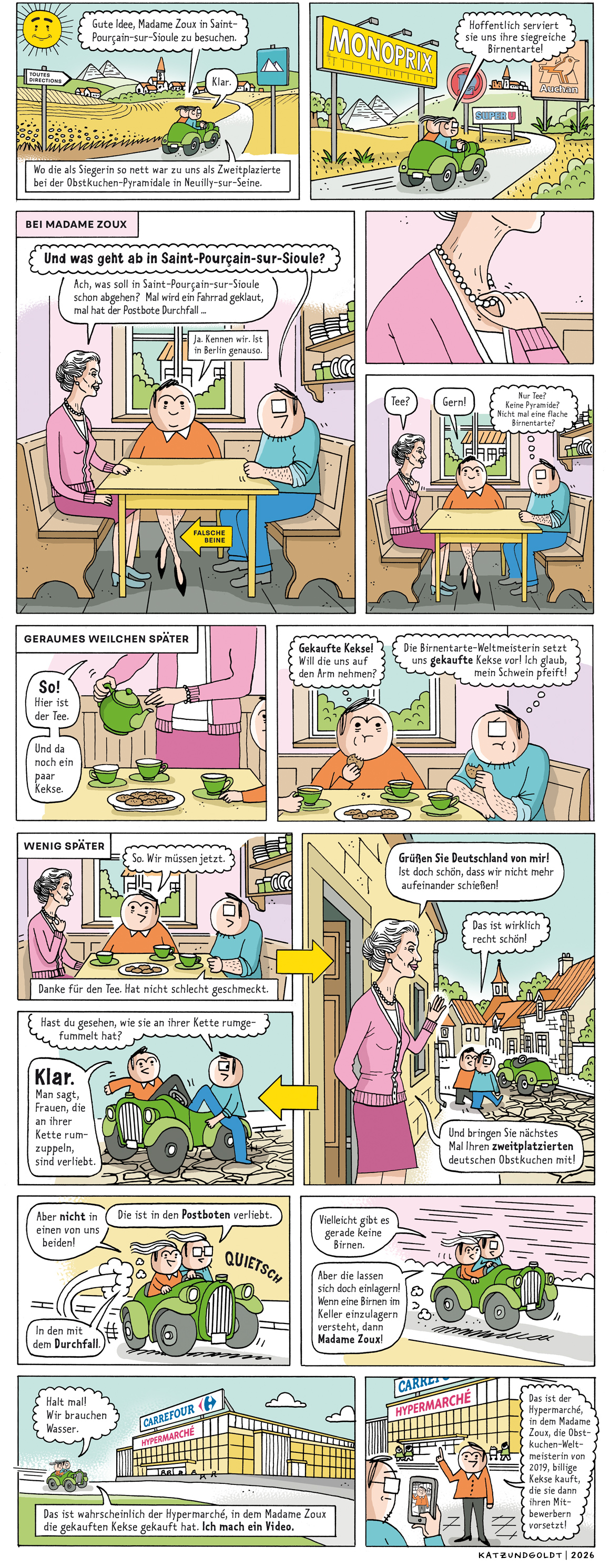 Erläuterung: Marie Solange Zoux leitete gemeinsam mit ihrem Mann Baptiste eine Tanzschule in Clermont-Ferrand. Nach Baptistes Tod wandelte sie die Tanzschule in eine Backschule um. „Tanzen kann man nur zu zweit, backen auch als Einzelperson“, teilte sie staunenden Lokaljournalisten mit. Nach dem Bankrott der Backschule 2025 zog sie nach Saint-Pourçain-sur-Sioule um, wo sie das Interesse am Backen verlor.
